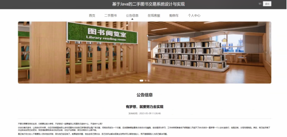 当游客打开系统的网址后,首先看到的就是首页界面。在这里,游客能够看到二手图书交易系统设计与实现的导航条显示首页、二手图书、公告信息、在线客服、购物车等,系统首页界面如图5-1所示: