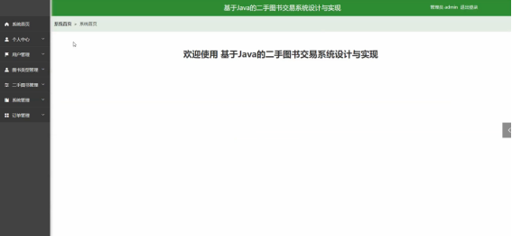 管理员进入系统主页面,主要功能包括对系统首页、个人中心、用户管理、图书类型管理、二手图书管理、系统管理、订单管理等进行操作。管理员主页面如图5-8所示: