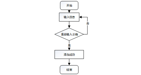 然后是添加信息的页面。进入该页面后,页面会出现一个提示框,示意操作者可以进行信息的添加,从而进行下一步的操作。用户输入想要添加的信息后提交,系统会对输入的内容进行检测。如果检测后输入的信息正确,则会出现“添加成功”的提示框,从而可以进行下一步操作;如果系统检测后检测到想要添加的信息不符合规范要求,则会提示报错,需要进行修改后重新添加。添加信息流程图如图3-2所示: