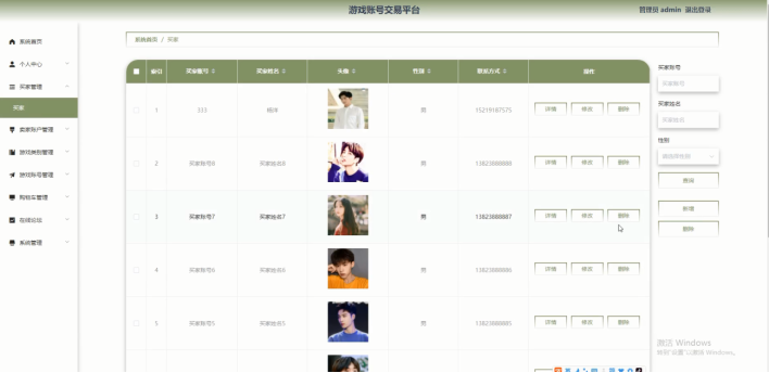 管理员点击买家管理。在买家页面输入买家账号、买家姓名和选择性别进行查询、新增或删除买家列表,并根据需要对买家详情信息进行详情、修改或删除操作;如图5-7所示: