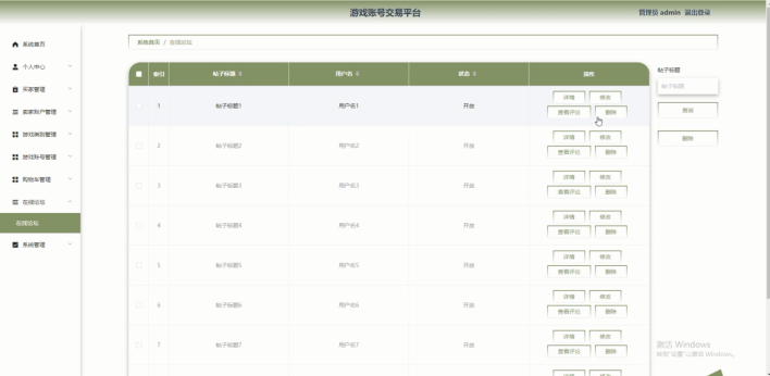 管理员点击在线论坛。在在线论坛页面输入帖子标题进行查询或删除在线论坛列表,并根据需要对在线论坛详情信息进行详情、修改、查看评论或删除操作;如图5-10所示: