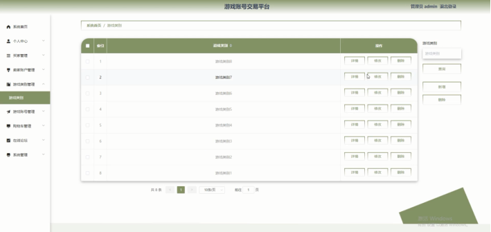 管理员点击游戏类别管理。在游戏类别页面输入游戏类别进行查询、新增或删除游戏类别列表,并根据需要对游戏类别详情信息进行详情、修改或删除操作;如图5-9所示: