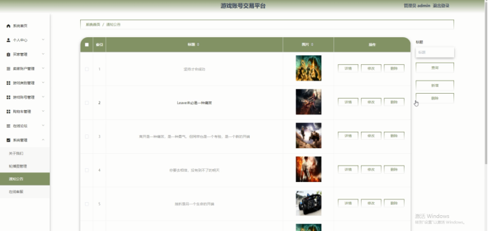 管理员点击系统管理。在通知公告页面输入标题进行查询、新增或删除通知公告列表,并根据需要对通知公告详情信息进行详情、修改或删除操作;还可以对关于我们、轮播图管理和在线客服进行详细操作;如图5-11所示: