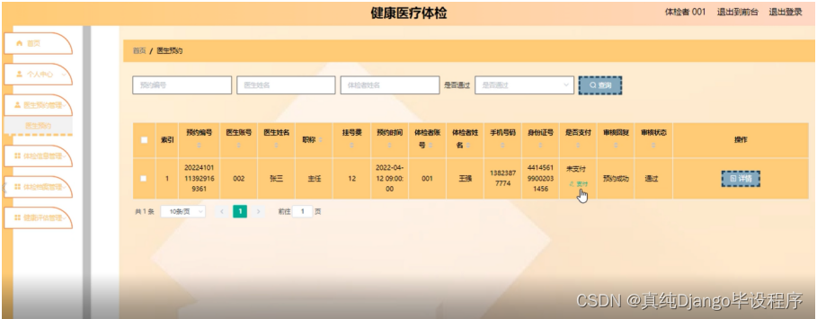 医生预约管理:在医生预约管理页面中可以查看预约编号、医生账号、医生姓名、职称、挂号费、预约时间、体检者账号、体检者姓名、手机号码、身份证号、是否支付、审核回复、审核状态等内容,并进行详情操作,如图5-13所示。