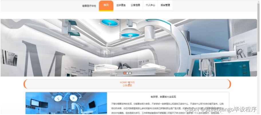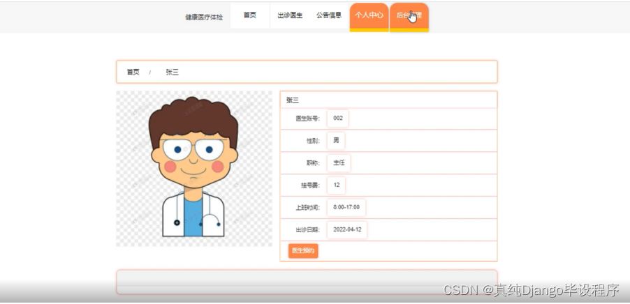 健康医疗体检,在网站首页可以查看首页、出诊医生、公告信息、个人中心、后台管理等内容操作,如图5-1所示。