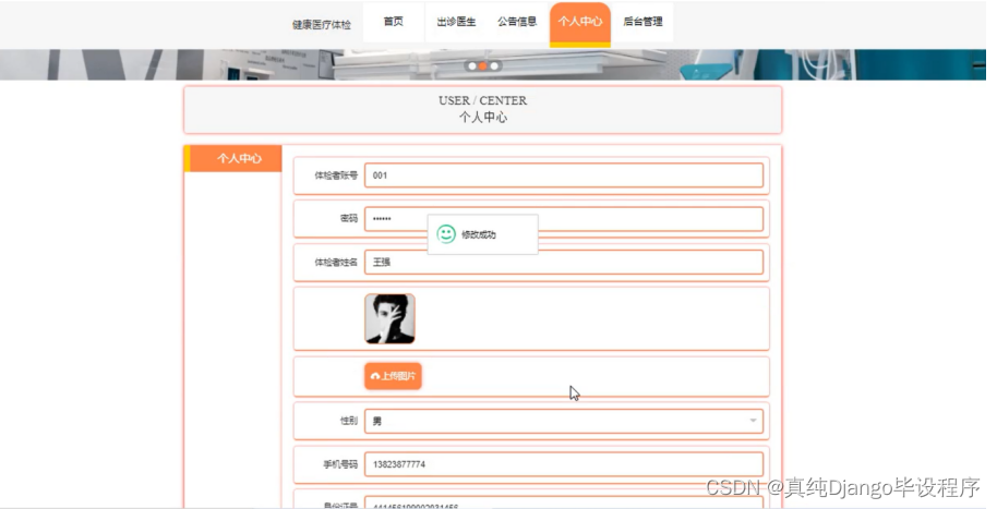 在个人中心页面通过编辑体检者账号、密码、体检者姓名、头像、性别、手机号码、身份证号等信息进行修改更新信息操作,如图5-4 所示。