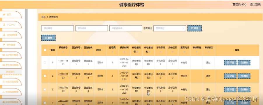 医生预约管理;在医生预约管理页面中可以查看预约编号、医生账号、医生姓名、职称、挂号费、预约时间、体检者账号、体检者姓名、手机号码、身份证号、是否支付、审核回复、审核状态等内容,并进行详情或删除等操作;如图5-10所示。