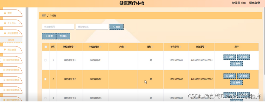 体检者管理:在体检者管理页面中可以查看体检者账号、体检者姓名、头像、性别、手机号码、身份证号等内容,并进行详情、修改或删除等操作,如图5-7所示。
