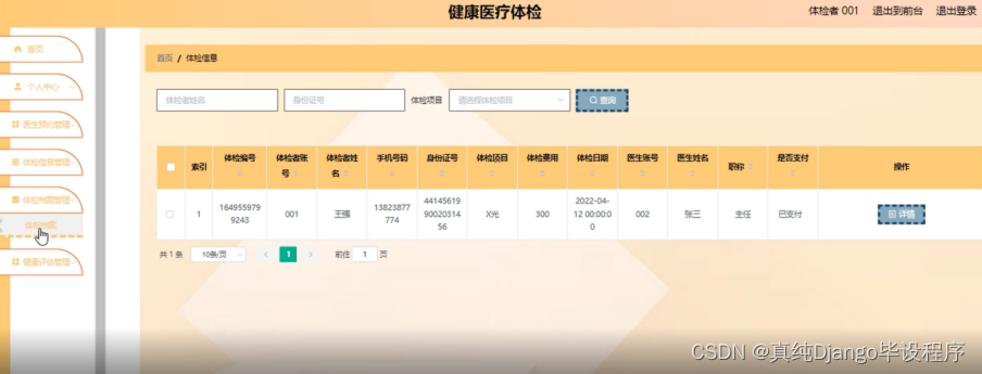 体检信息管理;在体检信息管理页面中可以查看体检编号、体检者账号、体检姓名、手机号码、身份证号、体检项目、体检费用、体检日期、医生账号、医生姓名、职称、是否支付等内容,并进行详情操作;如图5-14所示。