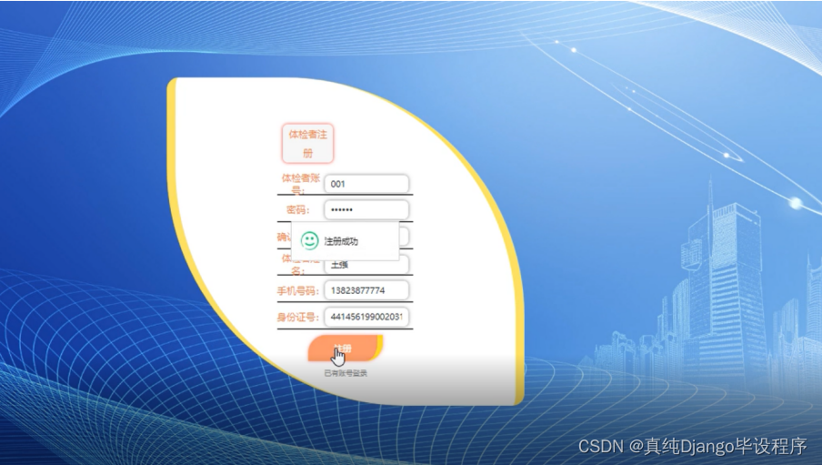 体检者注册,在注册页面可以填写体检者账号、密码、确认密码、体检者姓名、手机号码、身份证号等详细内容进行注册,体检者登录,在登录页面填写账号、密码进行登录,如图5-2所示。