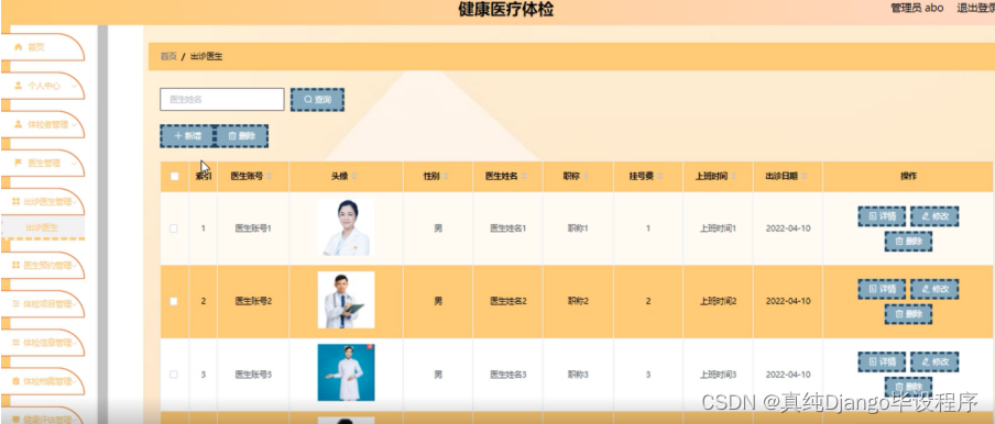 出诊医生管理;在出诊医生管理页面中可以查看医生账号、头像、性别、医生姓名、职称、挂号费、上班时间、出诊日期等内容,并进行详情、修改或删除等操作;如图5-9所示。