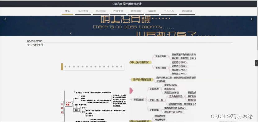 C语言在线评测系统,在系统首页可以查看首页、学习资料、学习视频、在线交流、在线评测、留言板、个人中心、在线咨询等内容,并进行详细操作;如图5-1所示。