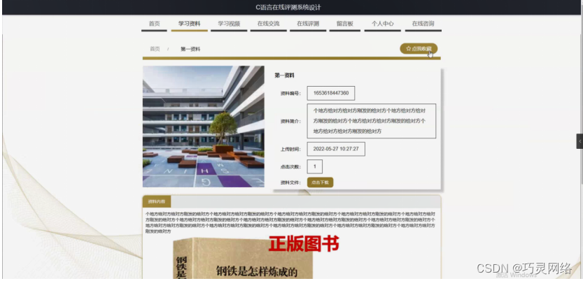 学习资料,在学习资料页面可以查看资料编号、资料名称、资料简介、上传时间、封面、点击次数、资料文件、资料内容等信息,并进行收藏操作;如图5-3所示。