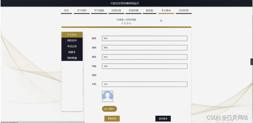 个人中心,在个人中心页面通过填写账号、密码、姓名、年龄、性别、手机、上传图片等内容进行更新信息,还可以根据需要对我的发布,考试记录,错题本,我的收藏进行详细操作,如图5-6所示。