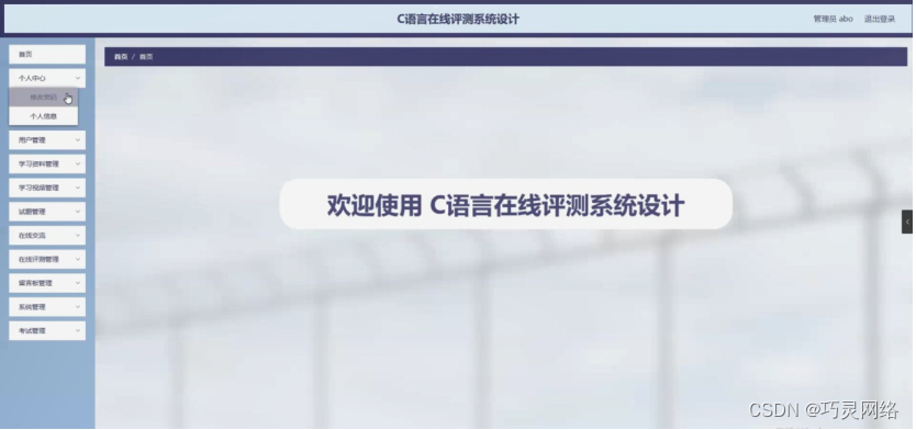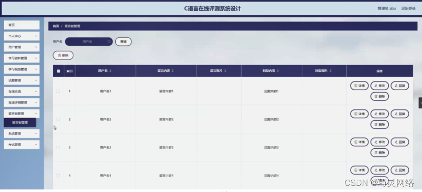 管理员登录系统后,可以对首页、个人中心、用户管理、学习资料管理、学习视频管理、试题管理、在线交流、在线评测管理、留言板管理、系统管理、考试管理等功能进行相应的操作管理,如图5-8所示。