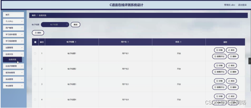 在线交流,在在线交流页面可以对索引、帖子标题、用户名、状态等内容进行详情,修改,查看评论或删除操作,如图5-13所示。