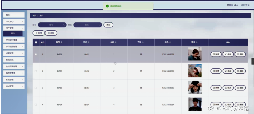 用户管理,在用户管理页面可以对索引、账号、姓名、年龄、性别、手机、照片等内容进行详情,修改和删除等操作,如图5-9所示。