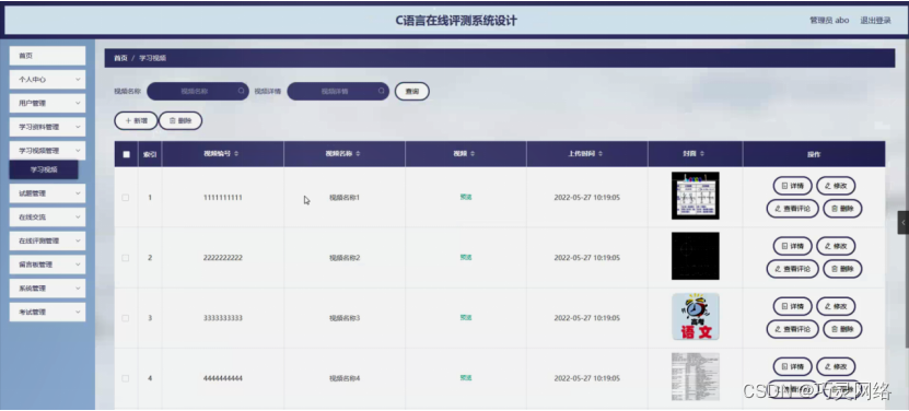 学习视频管理,在学习视频管理页面可以对索引、视频编号、视频名称、视频、上传时间、封面等内容进行详情,修改,查看评论或删除操作,如图5-11所示。
