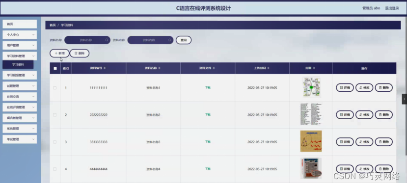 学习资料管理,在学习资料管理页面可以对索引、资料编号、资料名称、资料文件、上传时间、封面等内容进行详情,修改和删除操作,如图5-10所示。