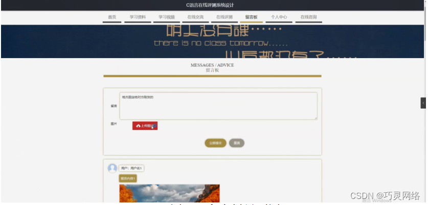 留言板,在留言板页面通过输入留言内容和上传图片等信息并立即提交或重置进行在线留言,还可以对留言内容和图片进行回复操作;如图5-5所示。