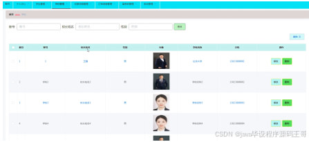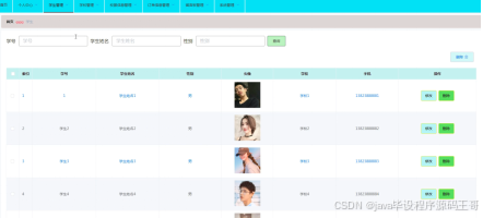 学生管理,在学生管理页面可以对索引、学号、学生姓名、性别、头像、学校、手机等内容进行修改或删除等操作,如图4-8所示。