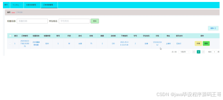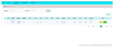 订单信息管理,在订单信息管理页面可以对索引、订单编号、校服名称、校服类型、账号、尺码、款式、价格、数量、总价格、下单时间、学号、学生姓名、手机、地址、是否支付等内容进行详情、删除等操作,如图4-16所示。