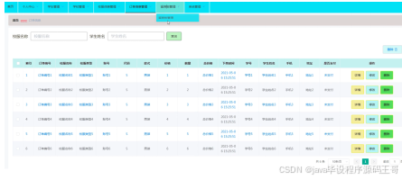订单信息管理,在订单信息管理页面可以对索引、订单编号、校服名称、校服类型、账号、尺码、款式、价格、数量、总价格、下单时间、学号、学生姓名、手机、地址、是否支付等内容进行详情、修改或删除等操作,如图4-11所示。