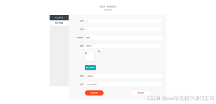 个人中心,在个人中心页面通过填写学号、密码、学生姓名、性别、学校、手机等信息进行更新信息,根据需要对我的收藏进行相对应操作,如图4-5所示。