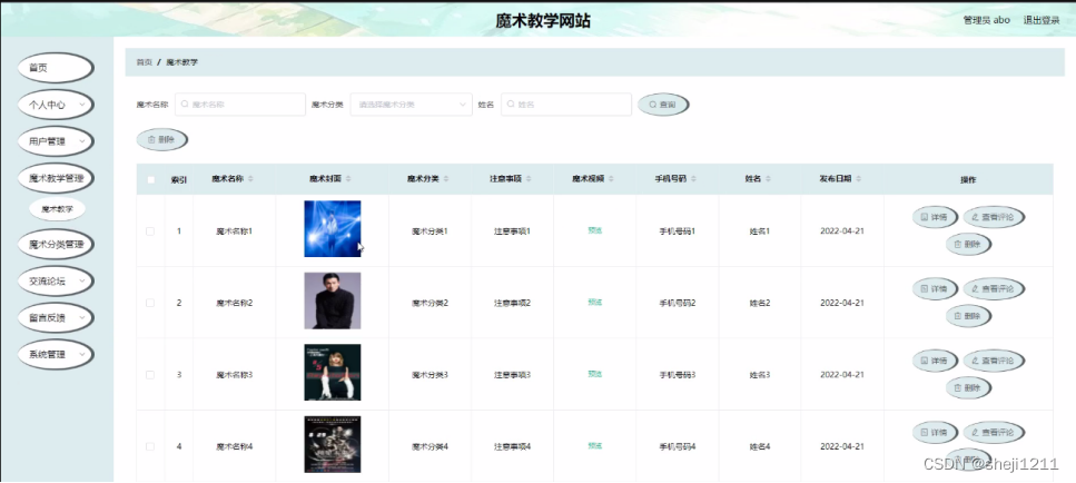 魔术教学管理,管理员可在魔术教学管理页面查看魔术名称、魔术封面、魔术分类、注意事项、魔术视频、手机号码、姓名、发布日期等内容,还可进行查看评论或删除等操作,如图5-13所示。