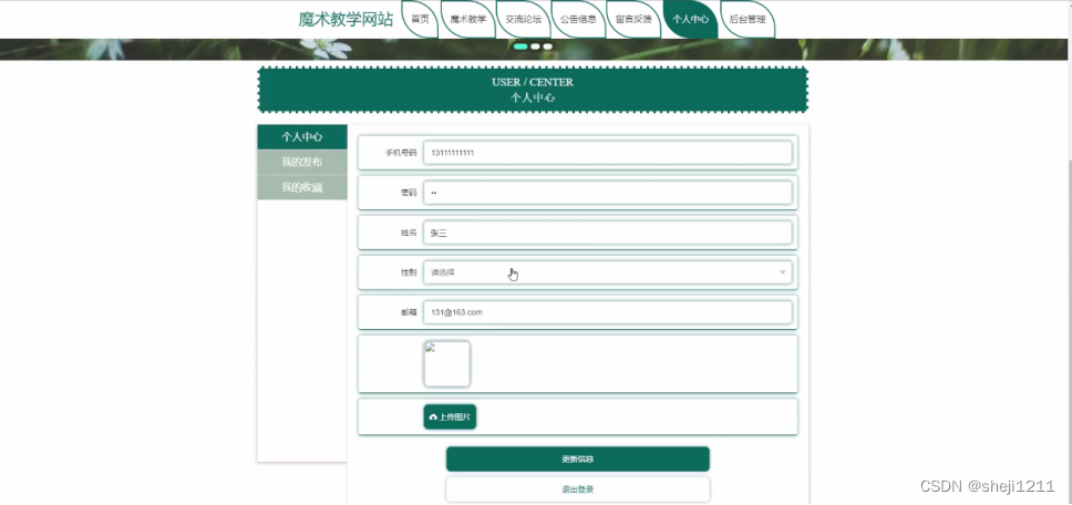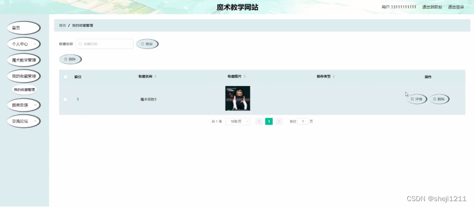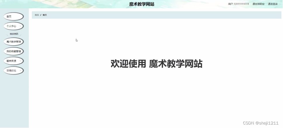 后台管理,用户进入系统后台可查看个人中心、魔术教学管理、我的收藏管理、留言反馈、交流论坛等内容,如图5-5所示。