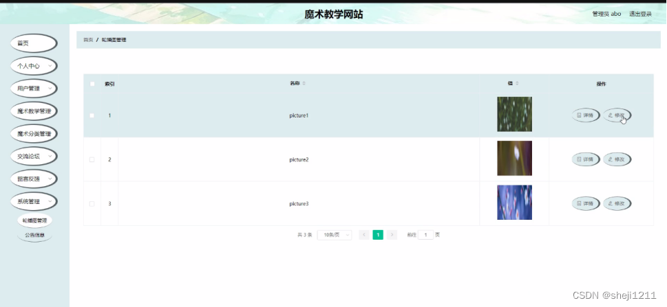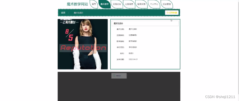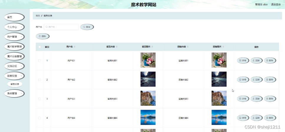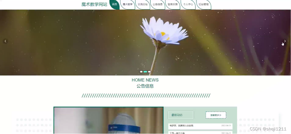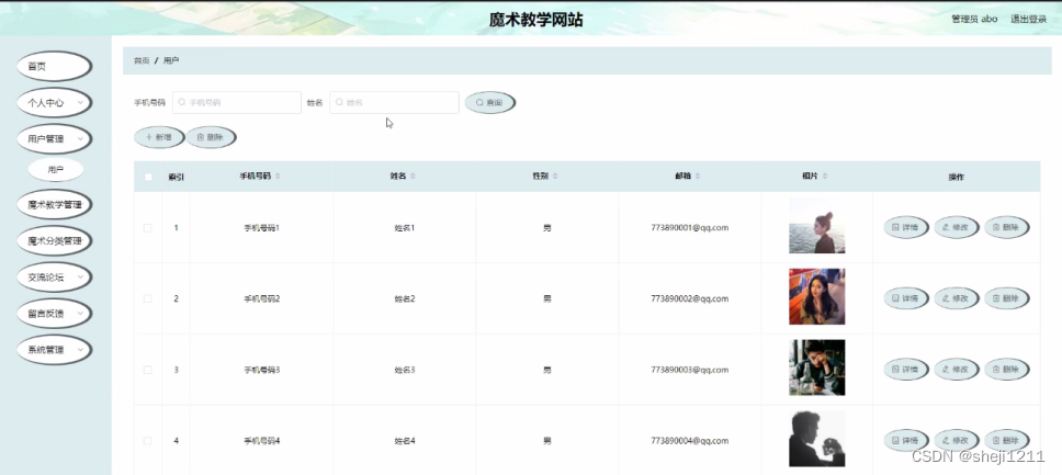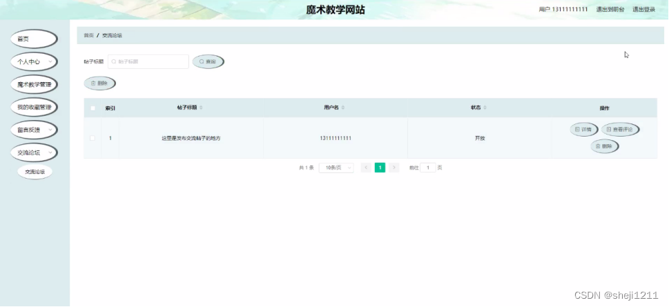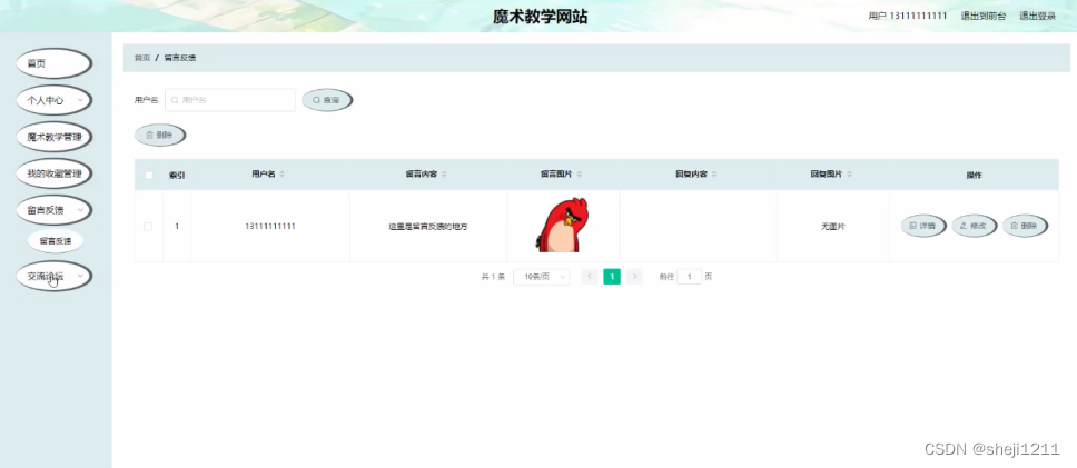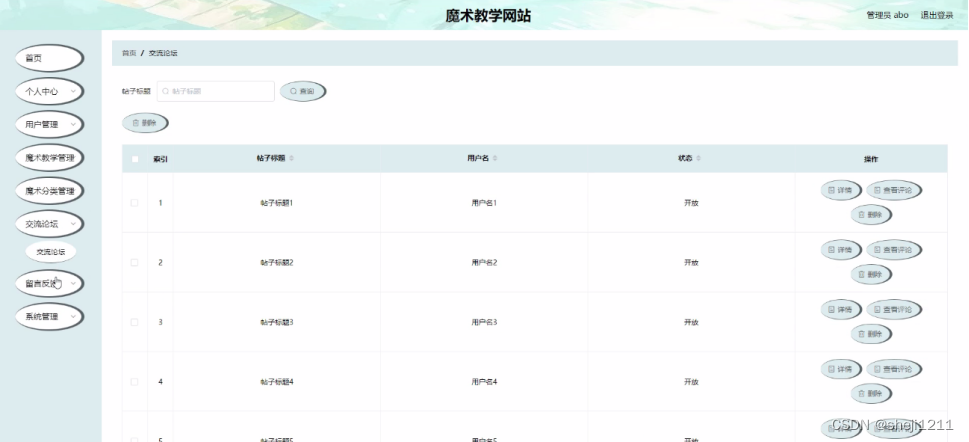 该项目是一个基于Node.js和Vue的魔术教学网站,包括用户注册、个人中心、魔术教学资源、交流论坛等功能。后台管理系统支持魔术教学管理、用户管理、留言反馈处理等操作。