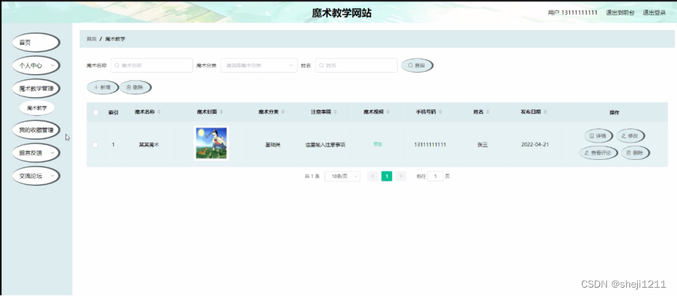 魔术教学管理,用户可在魔术教学管理页面查看魔术名称、魔术封面、魔术分类、注意事项、魔术视频、手机号码、姓名、发布日期等内容,还可进行新增、修改、查看评论或删除等操作,如图5-6所示。