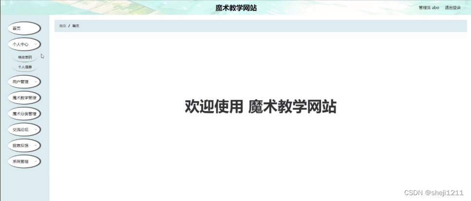 魔术教学网站,在系统首页可查看首页、魔术教学、交流论坛、公告信息、留言反馈、个人中心、后台管理等内容,如图5-1所示。