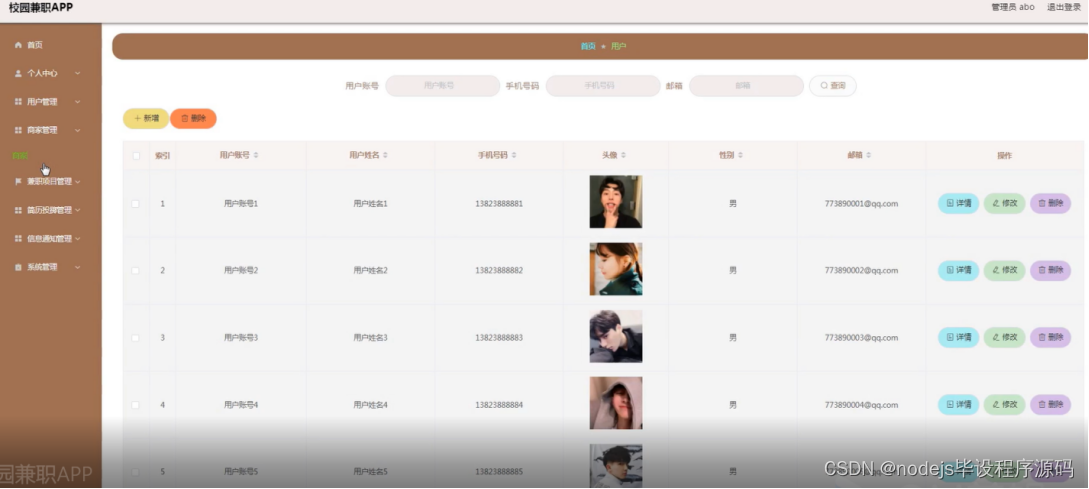 用户管理:在用户管理页面,可以查看用户账号、用户姓名、手机号码、头像、性别、邮箱等信息进行详情、修改、删除等操作,如图5-10所示: