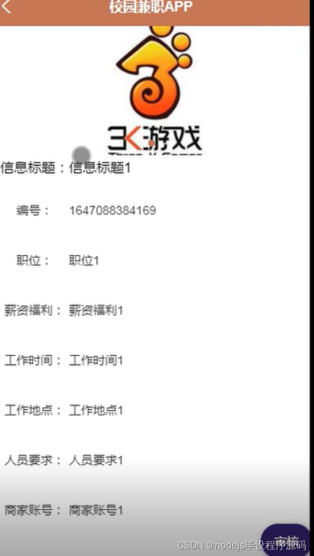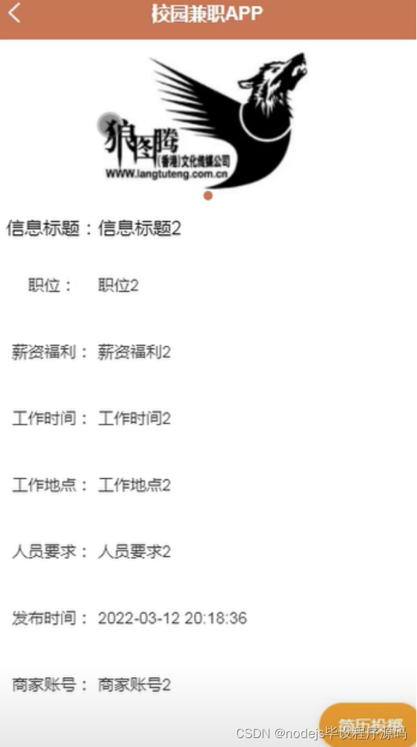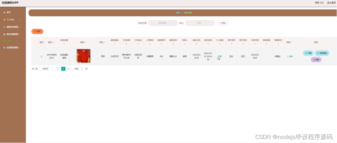 兼职项目,在兼职项目页面可以查看信息标题、封面、职位、薪资福利、工作时间、工作地点、人员要求、发布时间、商家账号等详细信息操作,如图5-4所示。