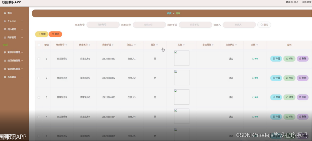 商家管理:在商家管理页面,可以查看商家账号、商家名称、商家手机、负责人、性别、头像、审核回复、审核状态、审核等内容,还能对商家管理进行详情、修改、删除等操作,如图5-11所示: