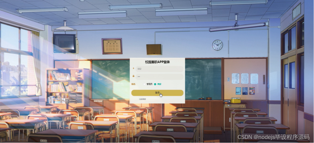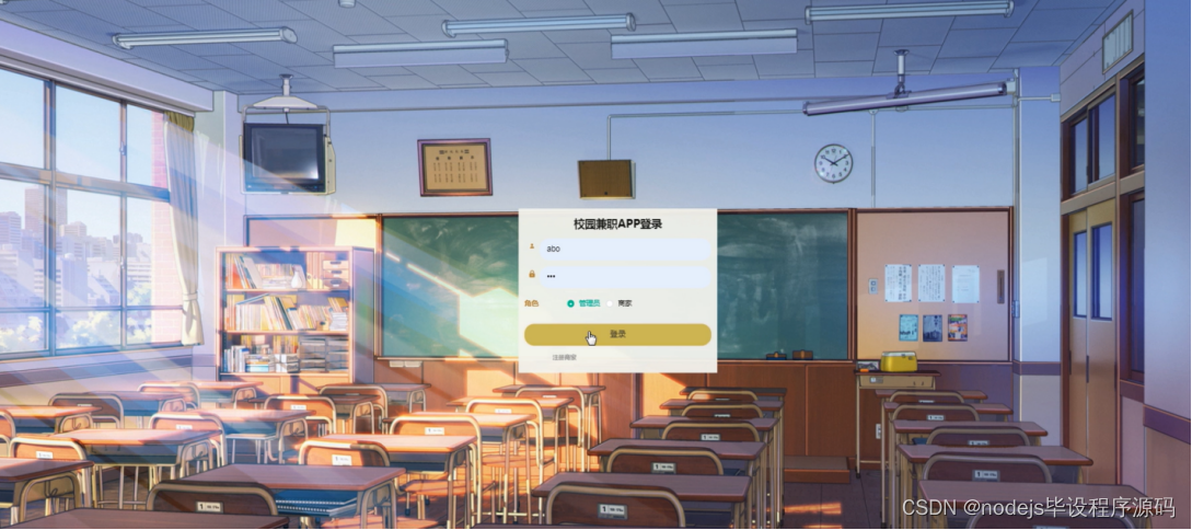 管理员要登录校园兼职APP网站,需要输入用户名和密码,选择登录角色进行登录,管理员登录界面如图5-8所示: