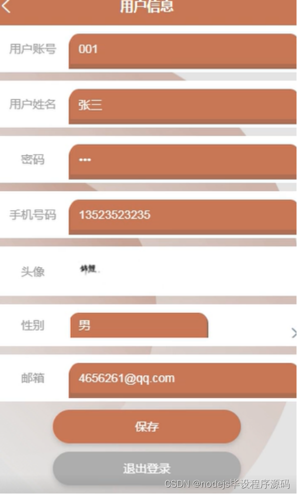 用户信息,在用户信息页面可以编写用户账号、用户姓名、密码、手机号码、头像、性别、邮箱等信息进行修改并保存,如图5-7所示。