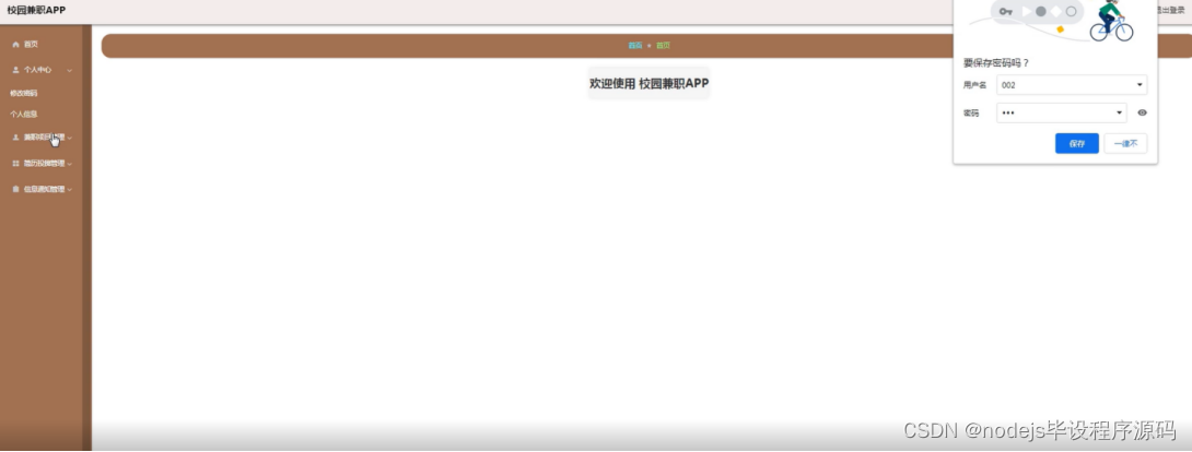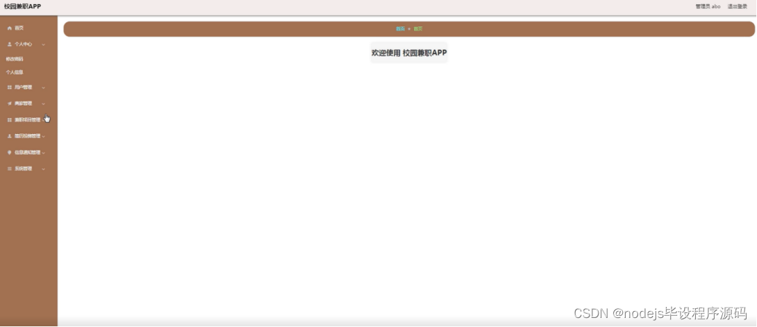 管理员功能:管理员进入校园兼职APP网站后,能对首页、个人中心、用户管理、商家管理、兼职项目管理、简历投掷管理、信息通知管理、系统管理进行操作。如下图5-9所示: