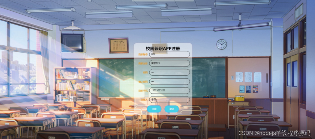 商家注册,在注册页面填商家账号、商家姓名、密码、确认密码、商家手机、负责人等详细信息进行注册,如图5-13所示。