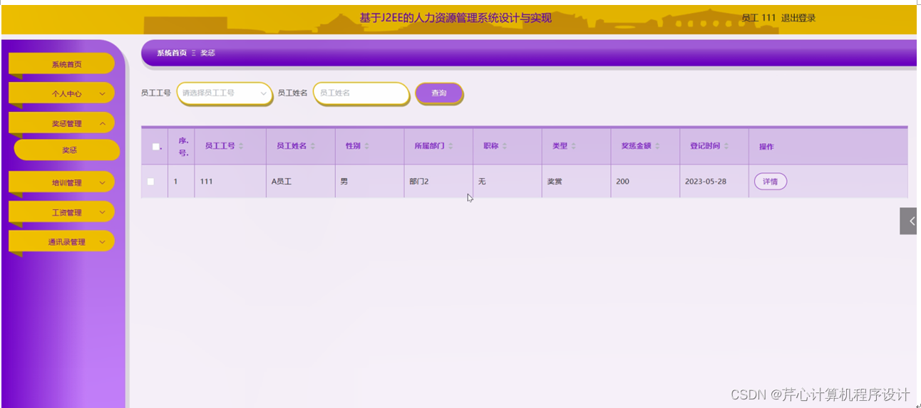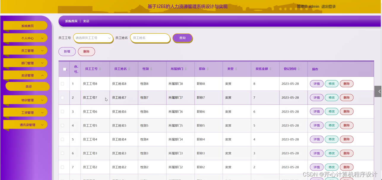 员工点击奖惩管理;在奖惩管理页面通过对员工工号、员工姓名、性别、所属部门、职称、类型、奖惩金额、登记时间等信息,进行查询或者删除奖惩等操作;如图5-11所示。