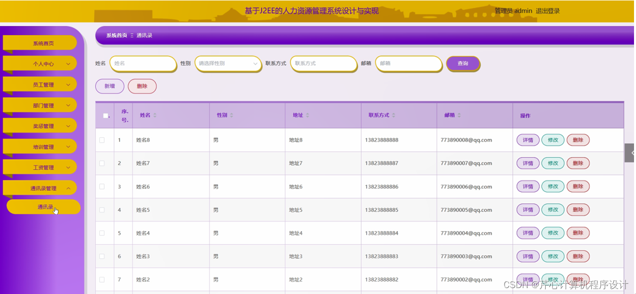 管理员点击通讯录管理,在通讯录管理页面对姓名、性别、地址、联系方式、邮箱等信息,可以查询或删除通讯录等操作。如图5-8所示:
