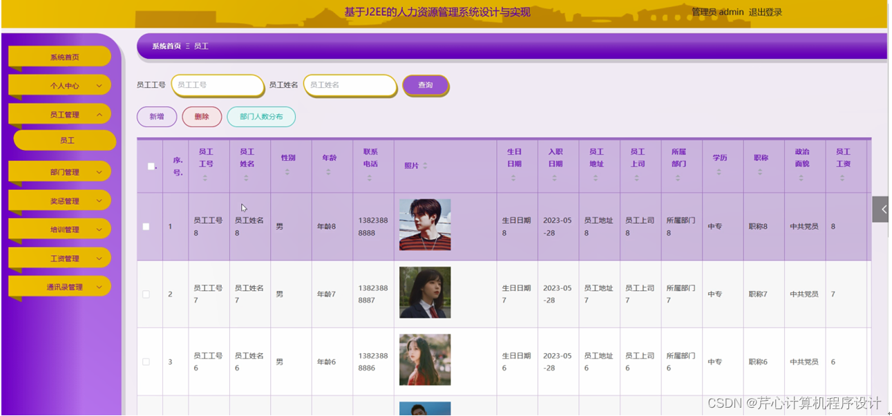 管理员点击员工管理,在员工管理页面对员工工号、员工姓名、性别、年龄、联系电话、照片、生日日期、入职日期、员工地址、员工上司、所属部门、学历、职称、政治面貌、员工工资、员工提成等信息,可以查询,新增或删除员工信息等操作。如图5-3所示:
