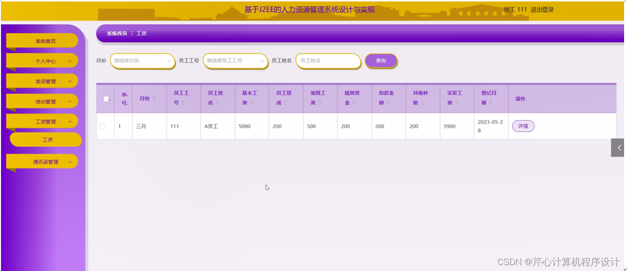 员工点击工资管理;在工资管理页面通过对月份、员工工号、员工姓名、基本工资、员工提成、加班工资、绩效奖金、扣款金额、其他补助、实发工资、登记日期等信息,进行查询工资等操作;如图5-13所示。