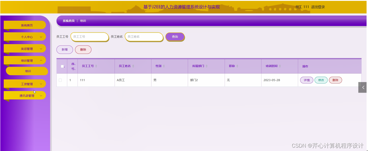 员工点击培训管理;在培训管理页面通过对员工工号、员工姓名、性别、所属部门、职称、培训时间等信息,进行查询、新增或者删除培训等操作;如图5-12所示。