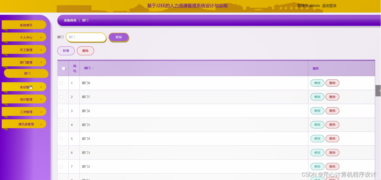 管理员点击部门管理,在部门管理页面对部门等信息,可以查询或删除部门等操作。如图5-4所示: