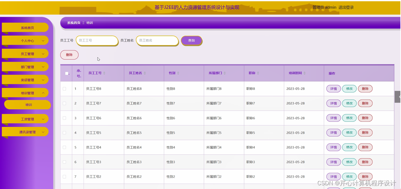 管理员点击培训管理,在培训管理页面对员工工号、员工姓名、性别、所属部门、职称、培训时间等信息,可以查询或删除培训等操作。如图5-6所示: