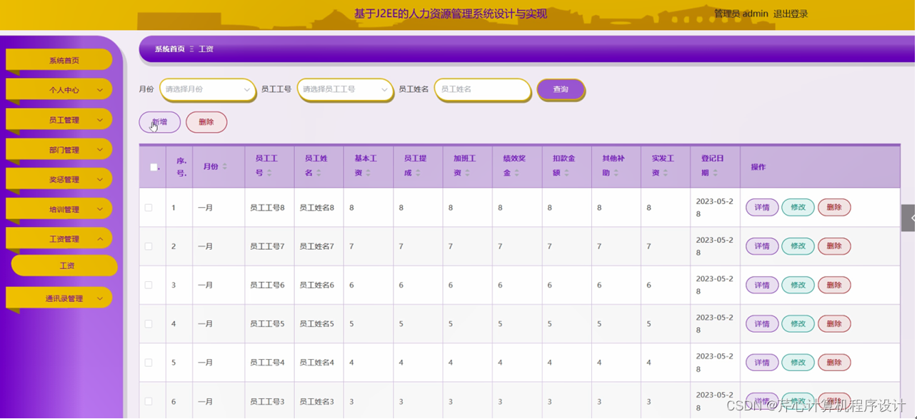 管理员点击工资管理,在工资管理页面对月份、员工工号、员工姓名、基本工资、员工提成、加班工资、绩效奖金、扣款金额、其他补助、实发工资、登记日期等信息,可以查询或删除工资等操作。如图5-7所示:
