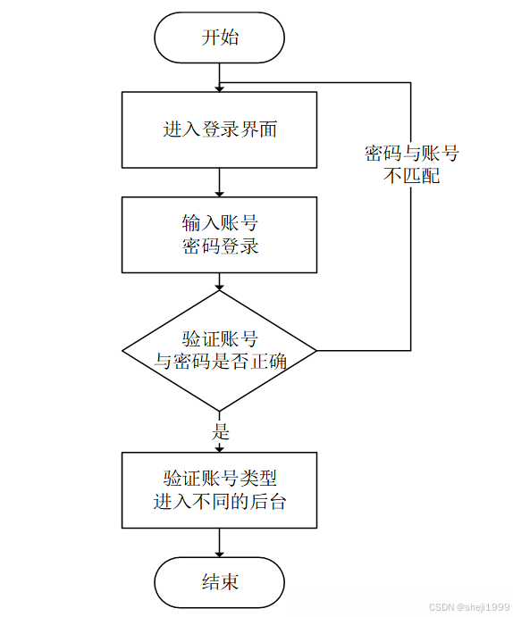登录流程是该系统的第一个流程,登录的第一步是输入账号、密码登录,系统会验证账号与密码是否正确,正确时系统会判断账号类型再进入不同的后台;不正确时,会返回到登录的第一步,输入用户重新执行登录流程。该流程如图3-1所示。