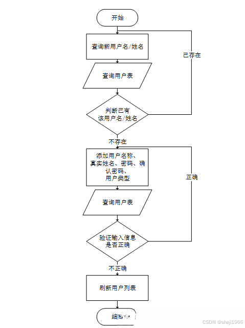 添加新用户的流程是先查询新用户名是否已存在,如已有该用户名,需重拟用户名并同时输入新用户的其它信息,添加新用户到数据库时会先验证数据是否完整,信息都正确且完整时,返回并刷新用户列表;信息不正确时,会返回输入信息的那一步。该流程如图3-2所示。